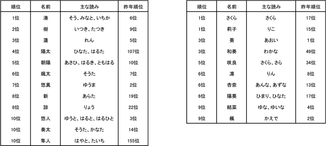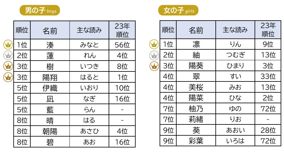 2024年生まれの赤ちゃんの名前ランキング、男の子1位は「湊 みなと 」、女の子は? アカチャンホンポ調査マイナビニュース。