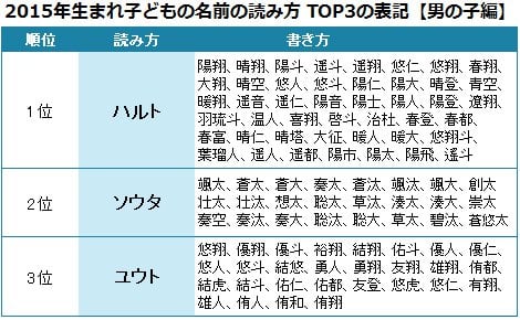 こどもの日 「男の子の名前」最新ランキングベスト30発表! 人気の漢字は「陽」「翔」「大」 - ライブドアニュース。