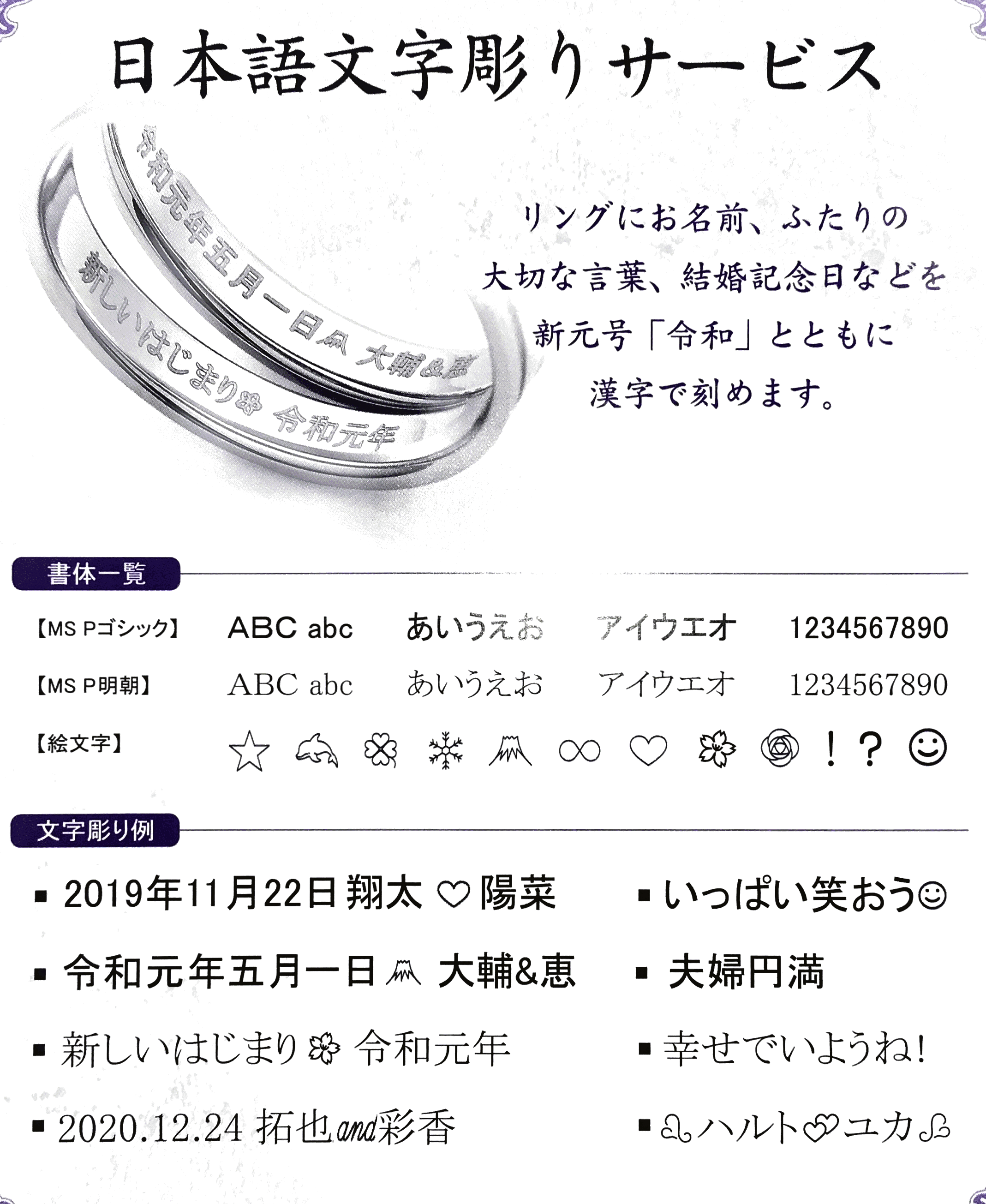 結婚指輪への刻印加工マリッジリング内側への刻印 、文字体フォント、選べます結婚指輪と。