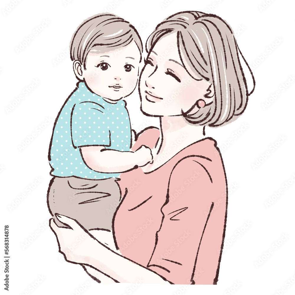 Illustration Stock 女性,人物,イラスト ,家族,女の子,幸せ,若い,愛,笑顔,母親,子供,かわいい,母,可愛い,日本人,ライフスタイル,赤ちゃん,お母さん,親子,20代,ママ ,抱っこ,明るい,楽しい,子育て,幸福,ベビー,抱く,育児,2人,おかあさん,息子,キッズ,ファミリー,娘,男の子。