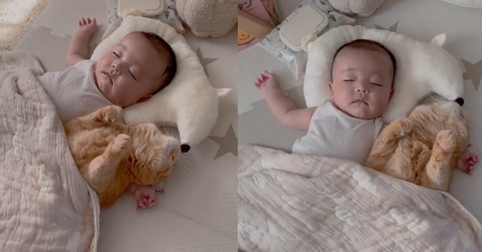 3カ月の赤ちゃんに腕枕してもらう2歳猫→一緒にぐっすり 究極の癒やし空間に「幸せしかない」「かわいー!!!」ねとらぼ。