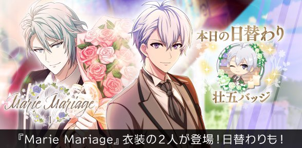アイドリッシュセブン公式@大神万理 on X: " ゲーム情報 本日6 30より、『Marie Mariage』衣装の壮五くんと楽くんが登場中!日替わりでは『壮五Marie Mariageバッジ』がもらえます! 初回半額の復刻オーディションも合わせて、是非チェックしてくださいね。アイナナ。