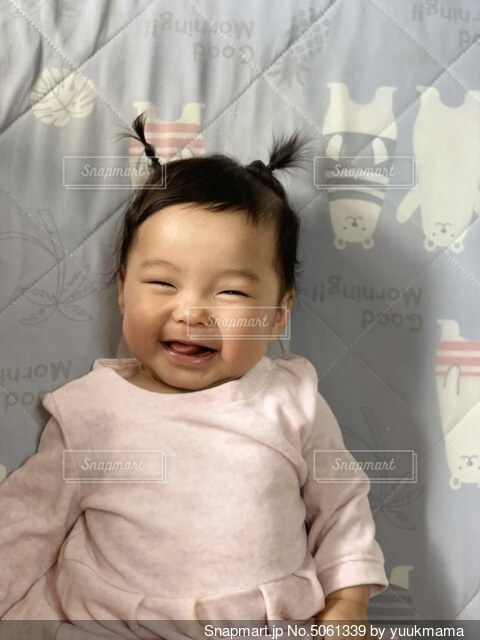 髪を二つに結んだ笑顔の女の子の赤ちゃんの写真・画像素材-Snapmart スナップマート。