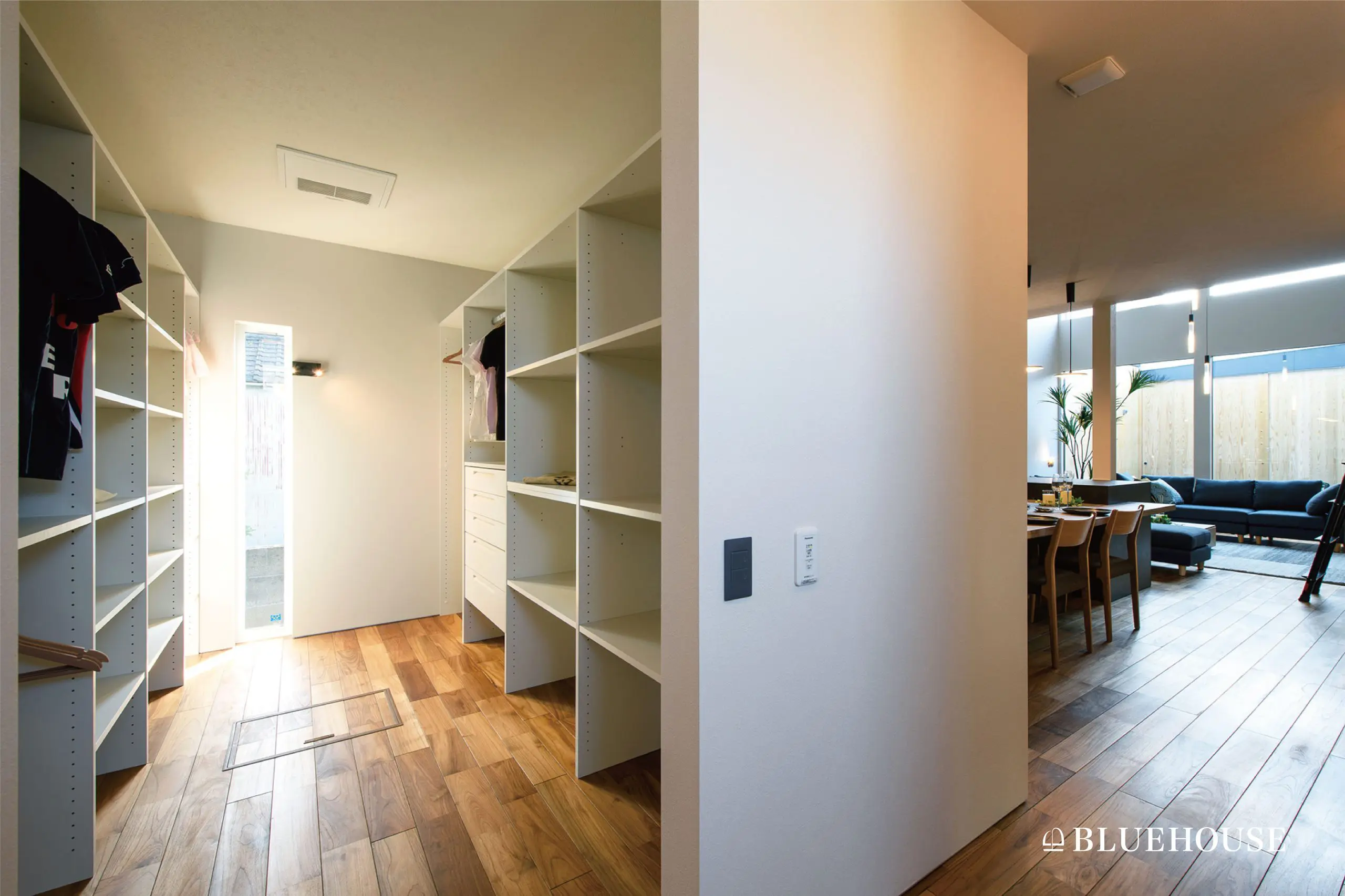 ファミリークローゼットの間取り実例最適な広さや設ける際の注意点は?注文住宅ブルーハウスデザイン・性能・リゾートライフ、愛知、名古屋、豊橋、豊川、岐阜ならお任せください。
