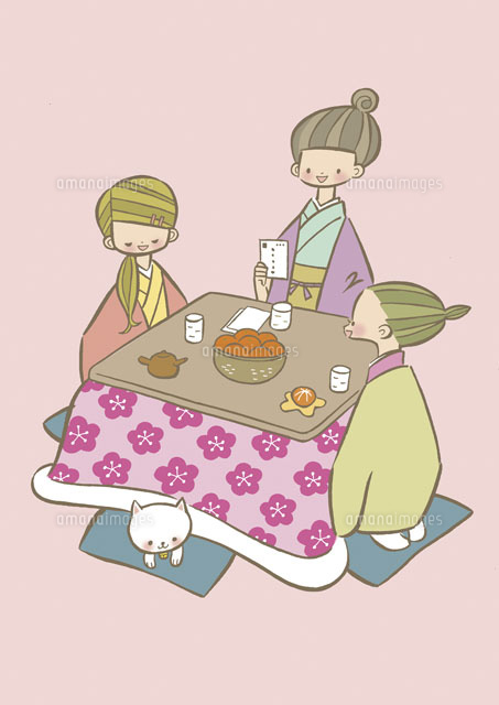 こたつで微笑む3人の女性 11017018790 の写真・イラスト素材アマナイメージズ。