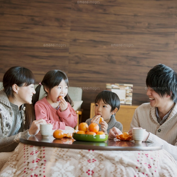 こたつに入る母娘3人 20037000021 の写真・イラスト素材アマナイメージズ。