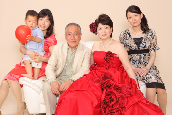 東京江東区の写真スタジオ、赤いドレスで、還暦祝い写真が撮れます江東区中央区江戸川区七五三・お誕生日・ピアノがある写真館。