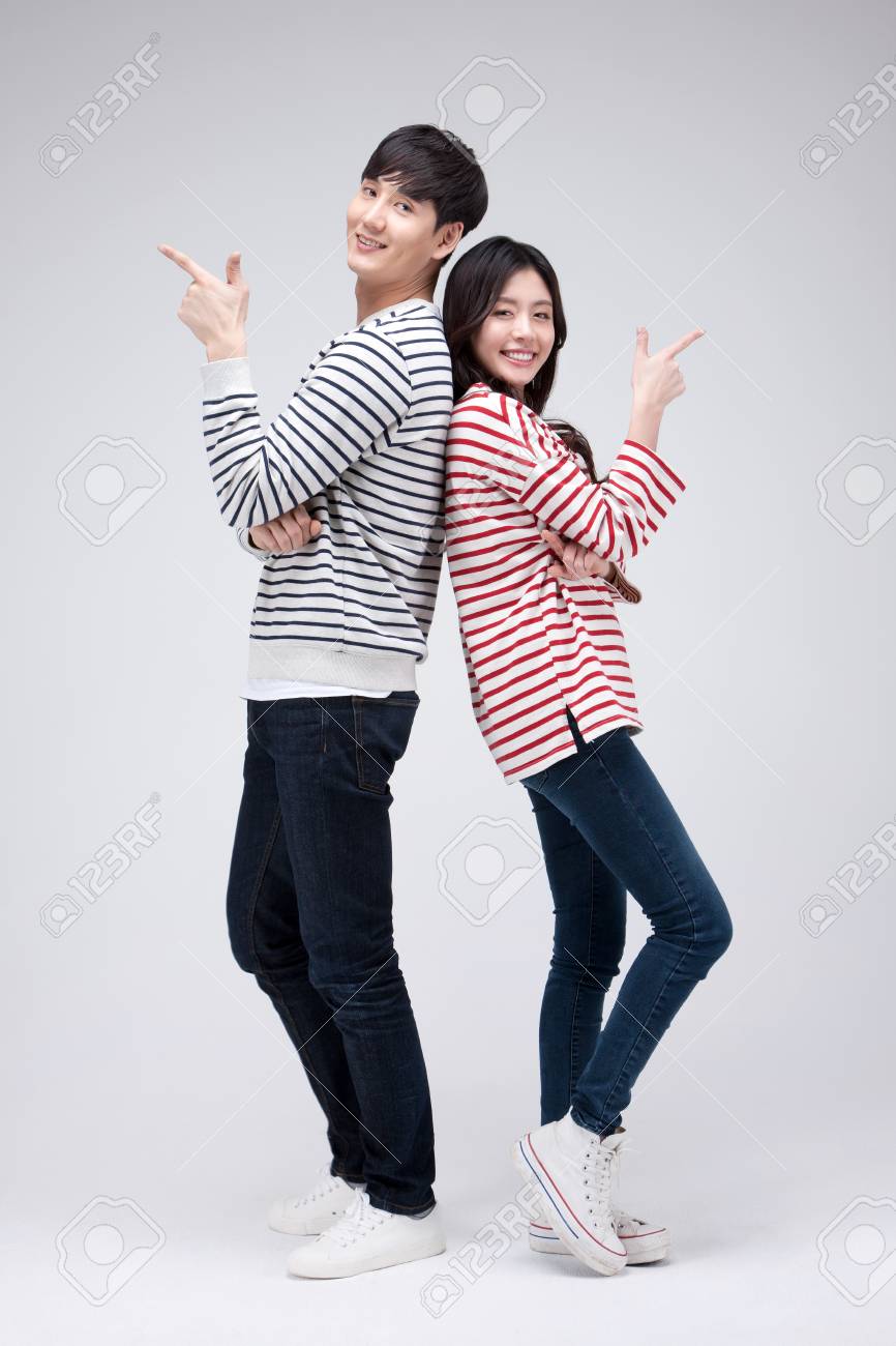 アジアの若いカップルが一緒にポーズ一致するシャツを着てスタジオに分離ショットの写真素材・画像素材 Image 84545183。