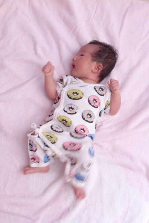 新生児の娘 かわいい😍 なんでこんなに脚短いの?!🤤 この服、私が着てたマタニティパンツをリメイクしてnewboneサイズに作り直したハンドメイドなのです。この服可愛過ぎてリビングに飾ってるの。うふふ。 ※脚の赤いのは赤アザのレーザー治療中なのです。そういえば1。