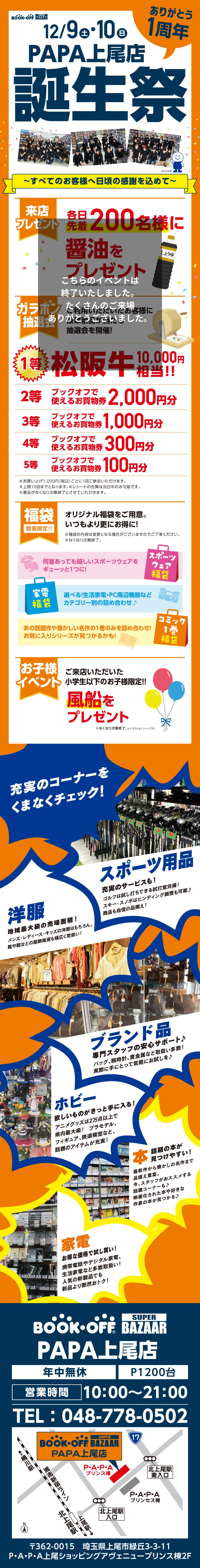 PAPA上尾店はオープンして1周年―12 9 土 10 日 は誕生祭♪―セール・イベント。