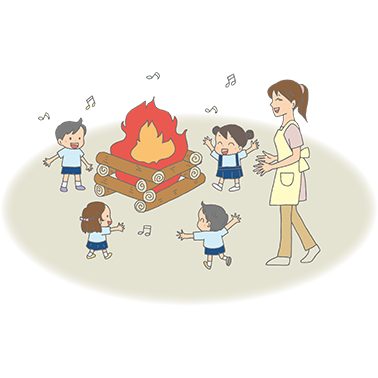 キャンプファイヤーを楽しむ子どもたちと先生」のかわいい手書きフリーイラストイラストわくわくBOX。