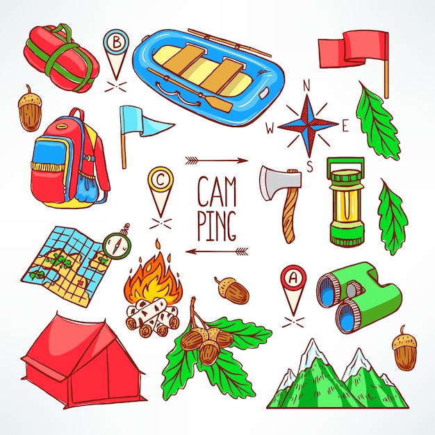 Vetor 手書きのキャンプのイラストのセット アイコン おしゃれ かわいい do StockAdobe Stock。