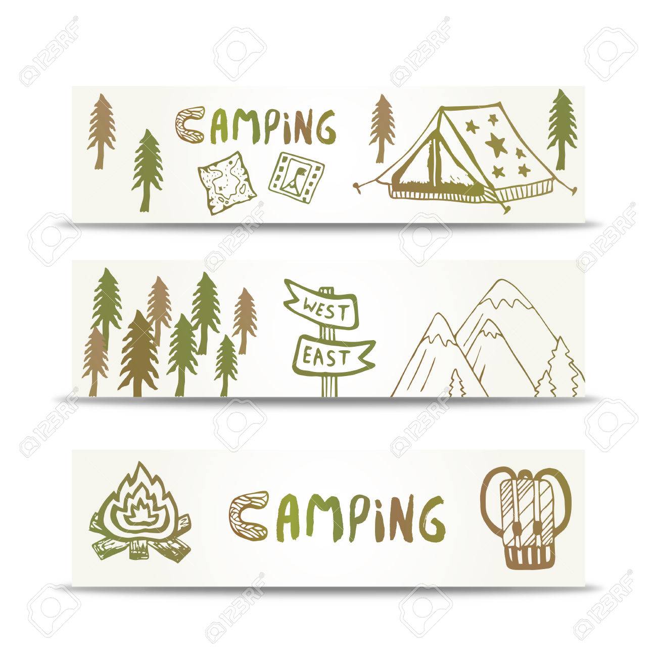 キャンプ バナー横山とテントを設定します。手書きのデザイン テンプレートの要素のイラスト素材・ベクター Image 42555308。