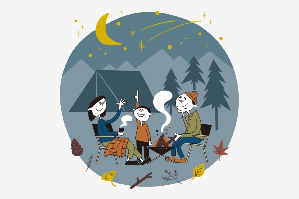小冊子用イラスト 秋冬のファミリーキャンプの楽しみ方。