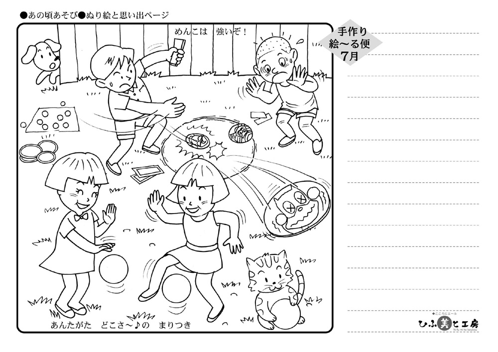 昭和の子どもが遊んでいた伝承あそび「まりつき」や「めんこ」の塗り絵ひふ美と工房*昭和スケッチ帳。