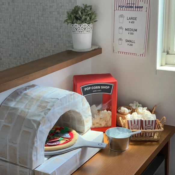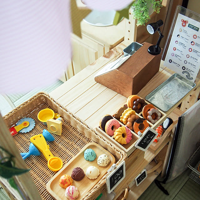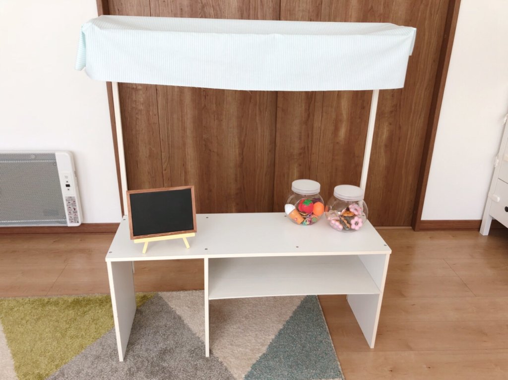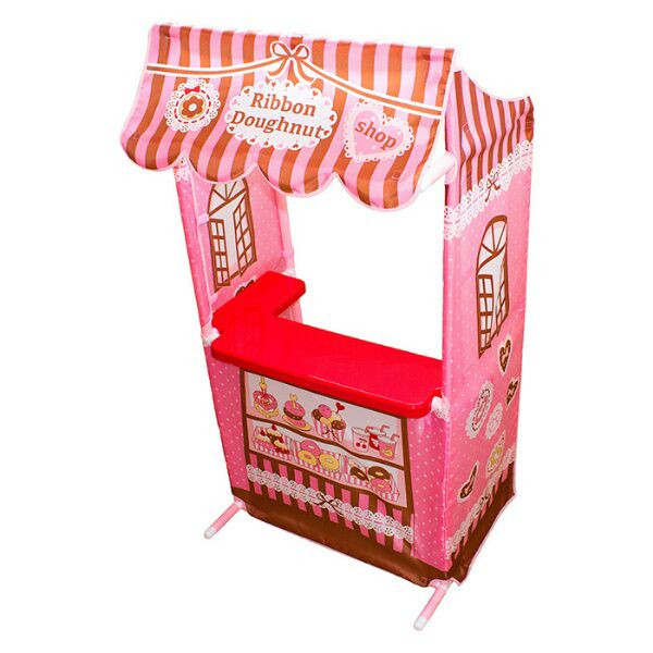 ままごとキッズテントのドーナツ屋さん リボンドーナツショップ カウンターテーブルセット株式会社リボンマルシェファミリー向けイベント・なりたいナ!キッズタウン、お店屋さんごっこテント。