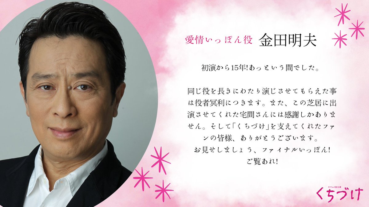大好きな金田明夫さん。 本当はお父さんと娘くらいの年の差だけど、森鴎外の一生を描いた作品で夫婦役演じたの。私はお父さんがいないから、時にはお父さんみたいな温かさで包んでくれて、俳優の大先輩としてたくさんの事を教えてくれて守ってくれて楽しませてくれた俳優。