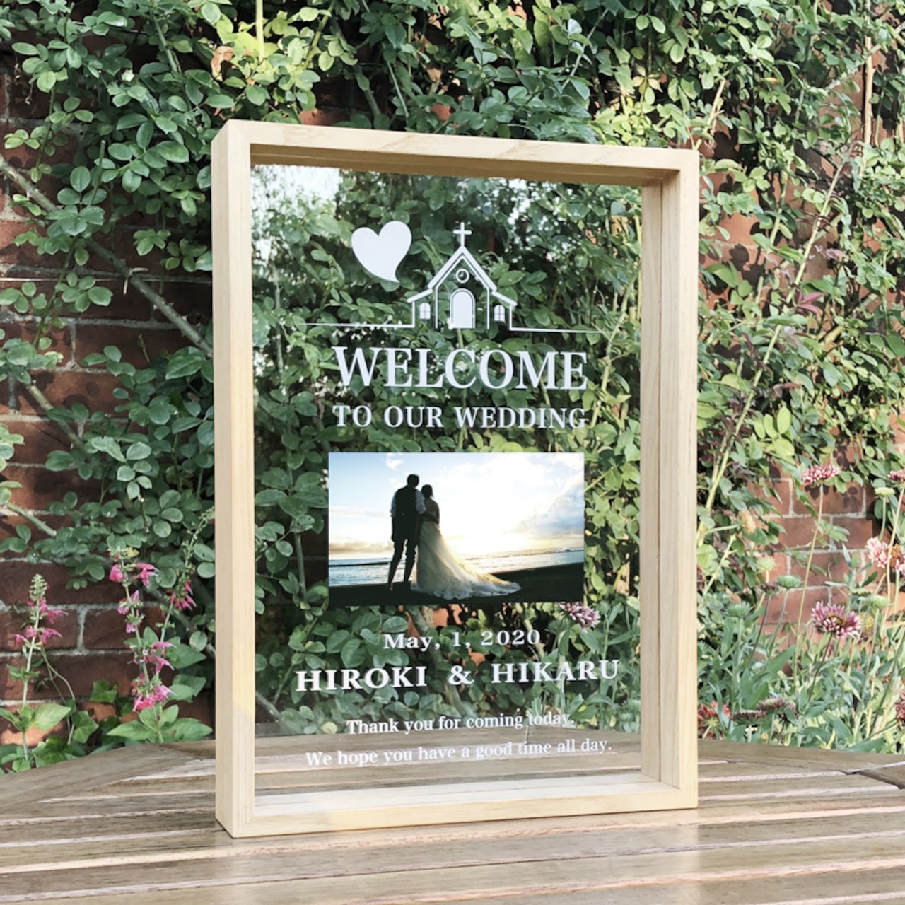 結婚式のウェルカムスペース、結婚のお祝いギフトにおすすめ 木製フレーム入り アクリル 写真入り ウェディングボード A4サイズ 名入れ ウェルカムボードururimo。