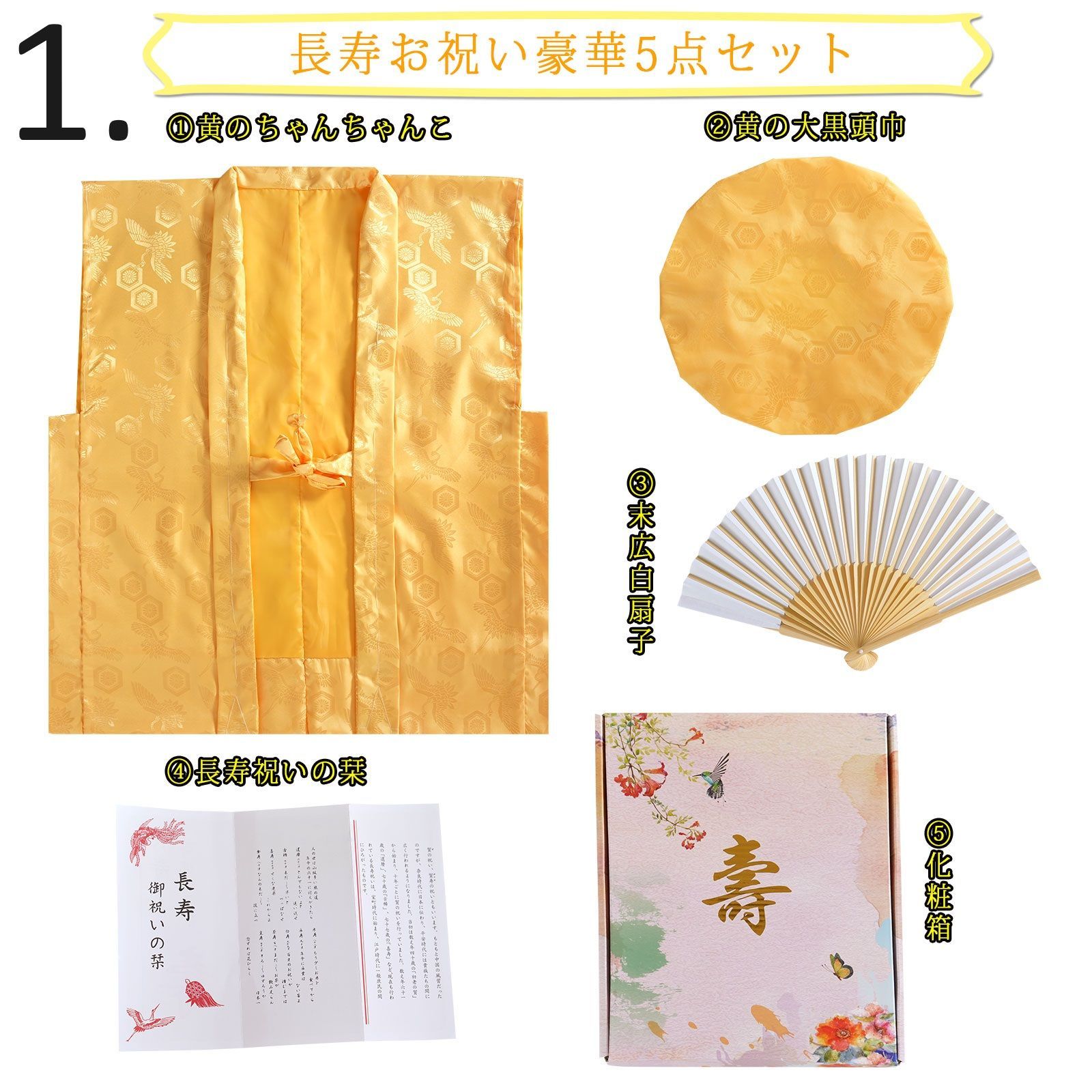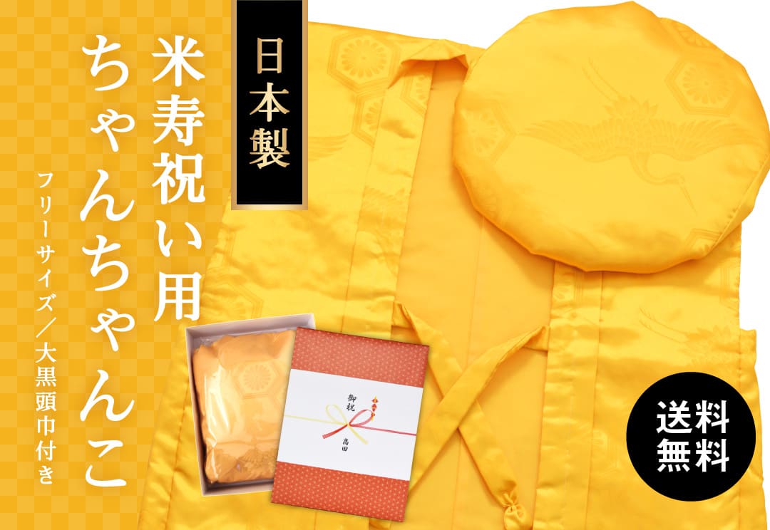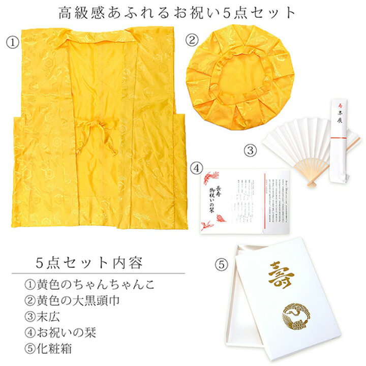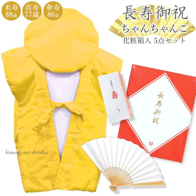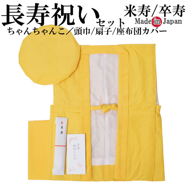 楽天市場傘寿・米寿・卒寿祝い黄色 長寿祝い ちゃんちゃんこセット お祝いセット ちゃんちゃんこと大黒頭巾と末広にお祝いの栞と化粧箱の5点セット 送料無料 <R> メール便不可: 京都きもの町。