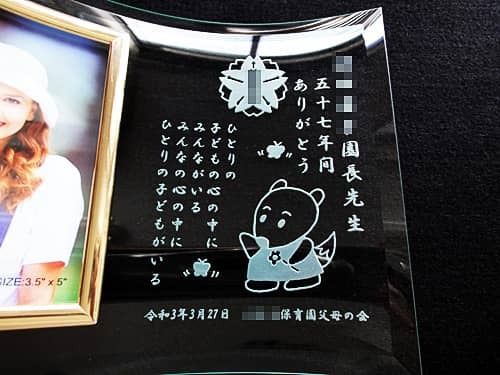 定年退職する園長先生への贈り物としてご注文いただいた写真立て: 名入れギフト・名入れ記念品の製作例ガラス彫刻工房 四季彩。
