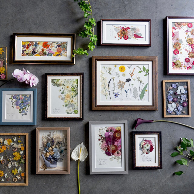 生花で作られた花束やウエディングブーケなど大切な思い出のお花を押し花やドライブーケに保存加工して、ずっと美しいまま手元に残す「アフターブーケ」。,どんなブーケがどんなアフターブーケになるのかご紹介します!, ✼•• ••✼•• ••✼, 落ち着いたグリーンの木製フレームは,花束のお花を引き立て、, グリーンに散りばめられた, さりげないゴールドとの, 絶妙なバランスで,。