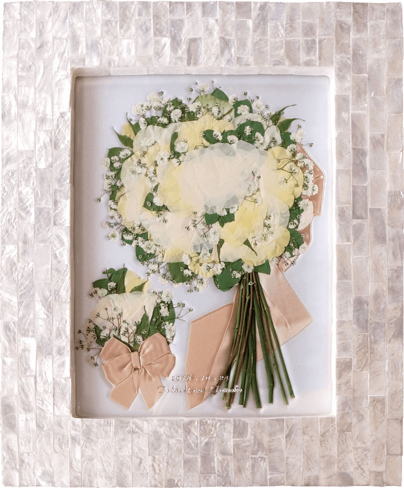 結婚式ブーケを保存生花ブーケをプリザーブドフラワーに加工して額にお入れします※お持込みOK・要料金問い合わせ。
