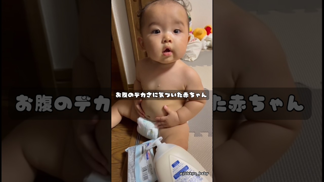 自分のお腹のデカさに気づき、唖然とする赤ちゃんbabyfunnyshorts赤ちゃん子育てダイエット。