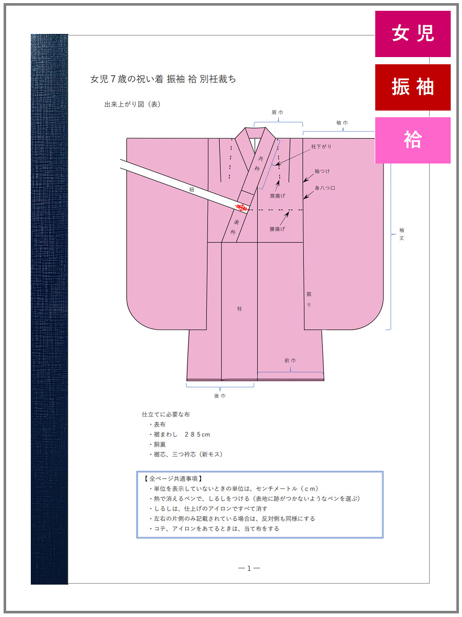 袷 あわせ 着物の作り方 子供用15 振袖別衽裁ち7歳 女の子。
