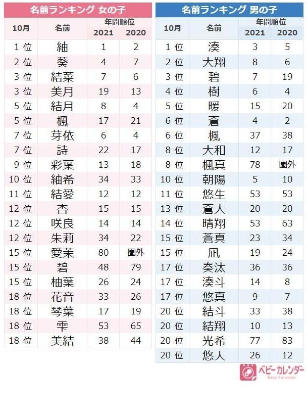 2022年『11月生まれベビーの名づけトレンド』発表!「楓」を用いた「秋 ネーム」が増加!「楓」「楓真」がTOP10入り!ワールドカップ出場のサッカー選手の名前も上位にランクイン!株式会社ベビーカレンダーのプレスリリース。