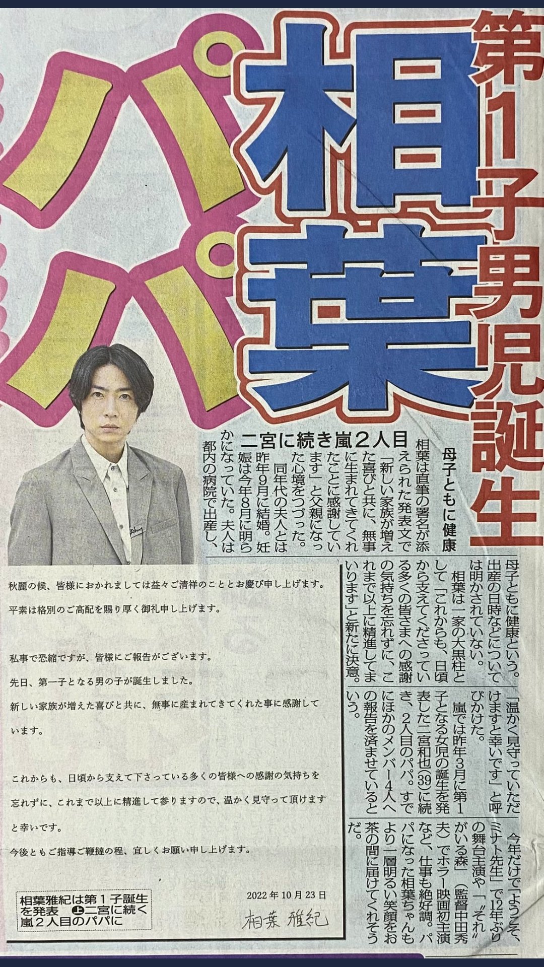 相葉雅紀パパに!ニノに続き嵐2人目 長男誕生「無事に産まれてきてくれた事に感謝」 - サンスポ。