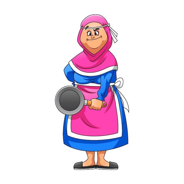いたずらな顔をしたピンクのエプロンを使ったお母さんのイラストPremiumベクトル素材。