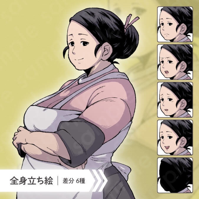 ペン画立ち絵素材 母や女将のような、ふくよかな40代〜50代女性のイラスト・現代・エプロン・差分6種 - 素材POMPACK - BOOTH。