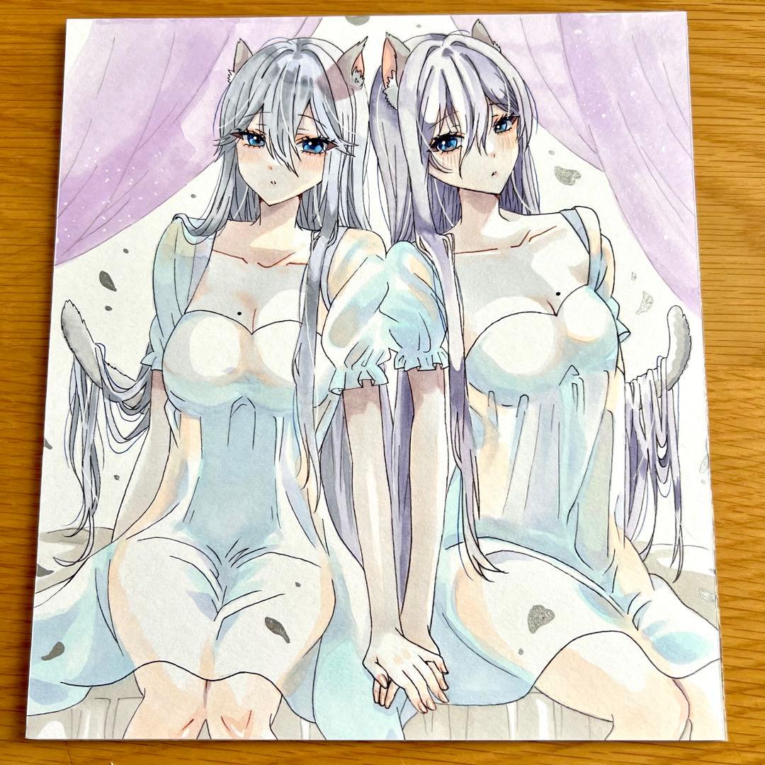 猫耳双子ちゃん 手描きイラスト オリジナルイラスト アナログイラスト ペアペア画イラストアイコン男女。