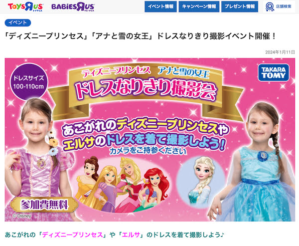 トイザらス無料イベント ディズニープリンセス&アナと雪の女王*ドレスなりきり撮影会 全国- ベビヨリ。