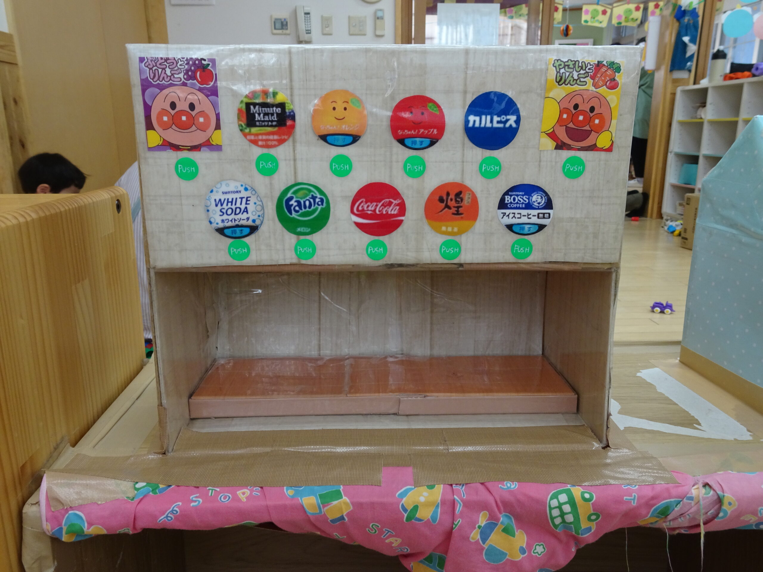手作りおもちゃ✨冷蔵庫✨, ままごとが大好きなささや園の子どもたち。, ままごとの遊びがもっともっと広がるように , という思いを込めて、,冷蔵庫を作りました😊✨, 冷蔵庫を開けて、ペットボトルや食べ物を出し入れしたり、, 冷蔵庫に貼ってあるイラストを「ピッ」と言いながら押して,自動販売機に見立てたりして遊んでいました!☆,福島市,認可保育園,保育園,キッズフィールド,。