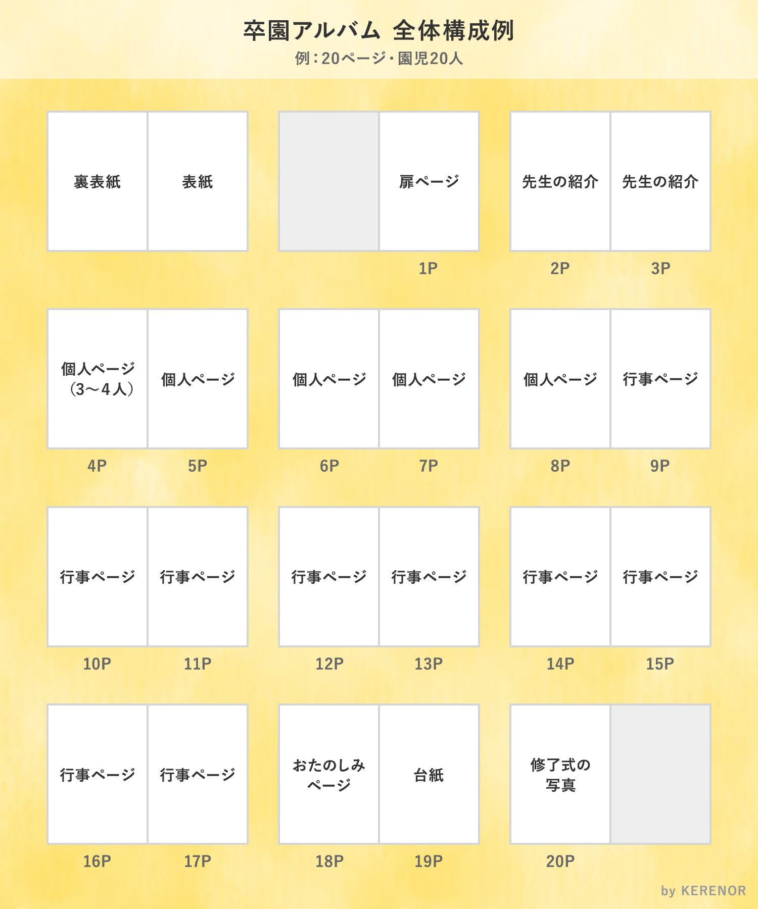 見本つき 卒園アルバムのページ構成例とレイアウトのアイデアKERENOR { ケレンオール }。