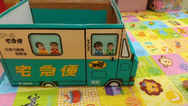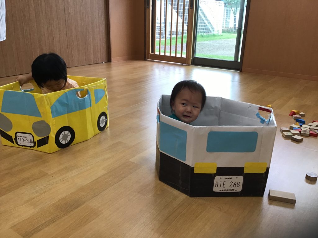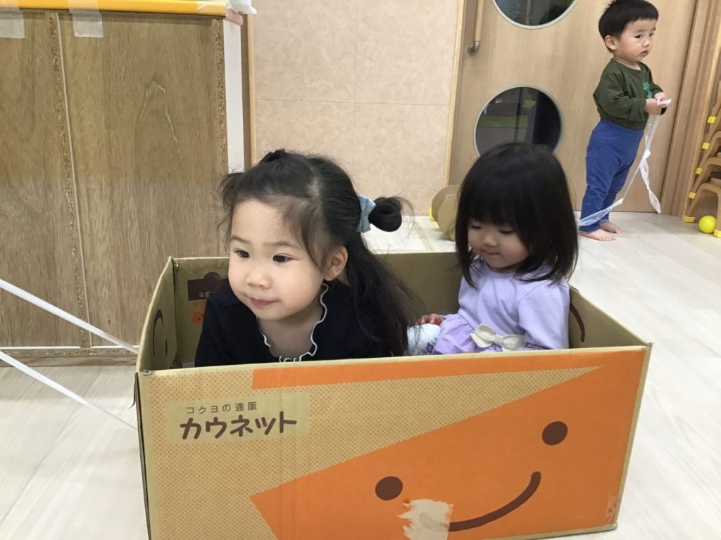 段ボールで乗り物🚙室内遊び🎵てとて保育園連絡帳のご紹介☆てとて保育園 ワンアベニュー。