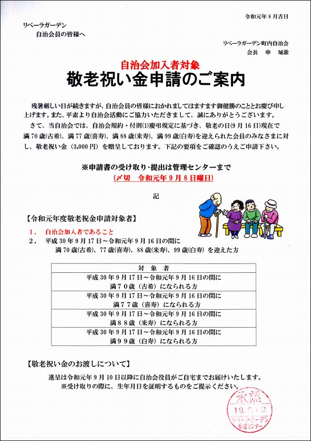 長寿お祝いの品贈呈のお知らせ 令和4年9月11日にお届けします- 日ノ出町自治会。