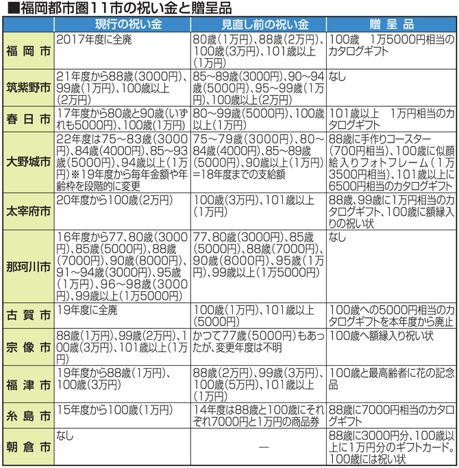 福岡都市圏で進む「敬老祝い金」の見直し 進む高齢化、予算額に格差 20市町村の制度一覧西日本新聞me。