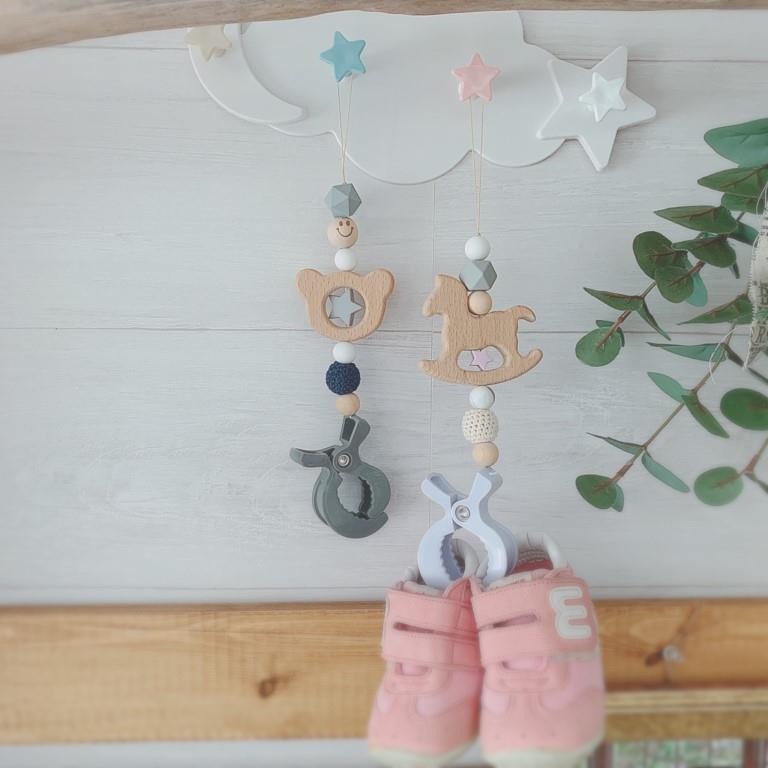 ベビーカーのシューズクリップ。 売ってるのをいろいろ探してみたんだけど デザインも同じようなものばかりで ピンとくるものがないしなのにまあまぁ高かったりするし それなら自分で作ろうと思って100均に出かけて 洗濯バサミと金具を買って 家にあったものと合わせて。