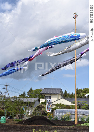 農家の庭先で元気に泳ぐ鯉のぼりの写真素材99783109- PIXTA。