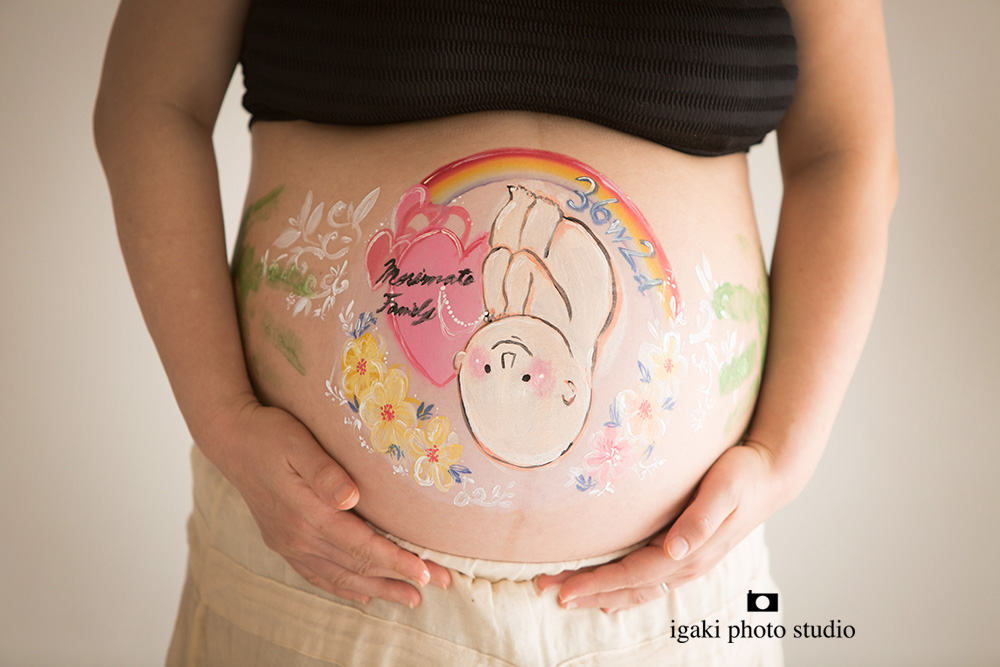 ベリーペイントでマタニティフォト。妊婦さんのお腹に絵を描きます。家族写真・結婚式などの記念撮影は豊岡市・城崎温泉の「イガキフォトスタジオ」へ。