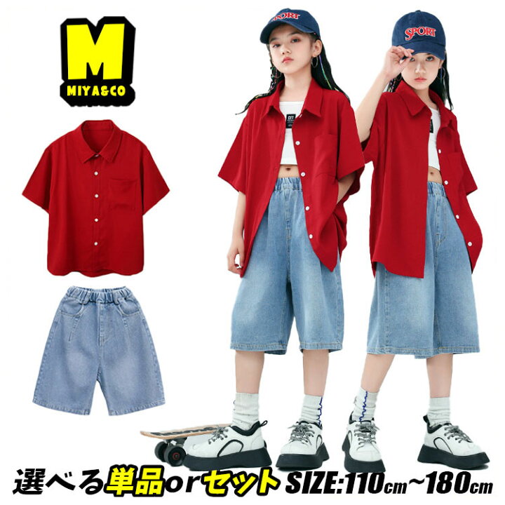 希少赤西仁 着用 セットアップ 同型同色 シャツ ショートパンツ 発表会 赤 シャツ レッド シャツ 無地 半袖 シャツ かっこいいキッズダンス衣装 セットアップ ヒップホップ ブルー デニム 短パン デニム ショートパンツ キッズ ダンスウェア 女の子 男の子 hiphop。