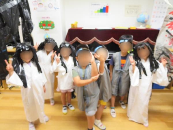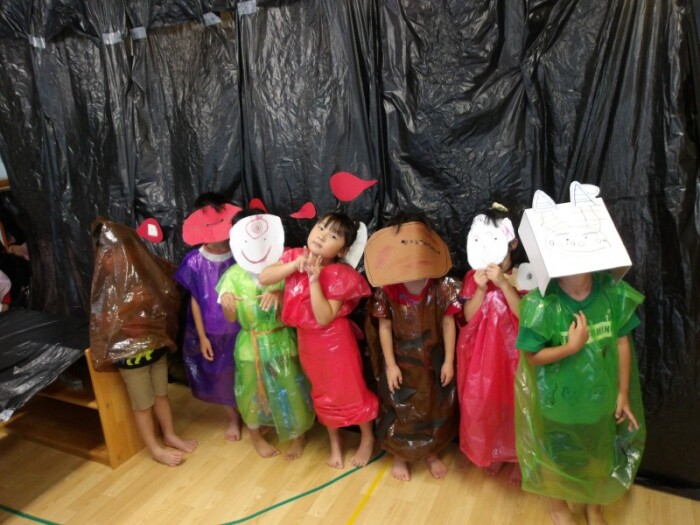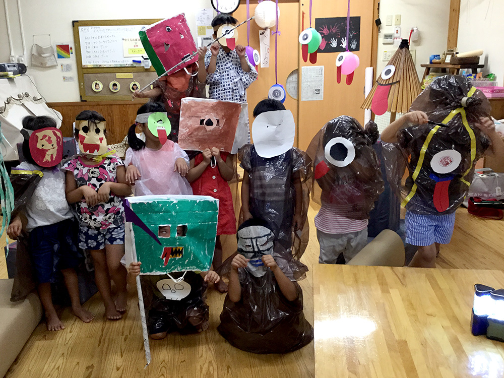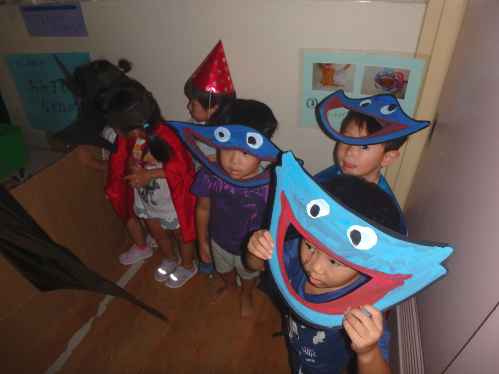 こんにちは南保育園です。 8月29日 わくわくタイムは ぞう組による「お化け屋敷」でした。 8月初めから、クラスみんなで話し合い、衣装、看板、大道具の準備を進めました。面白いアイデアもたくさん出て楽しく準備を進めることができましたよ。ドキドキの本番でしたが。