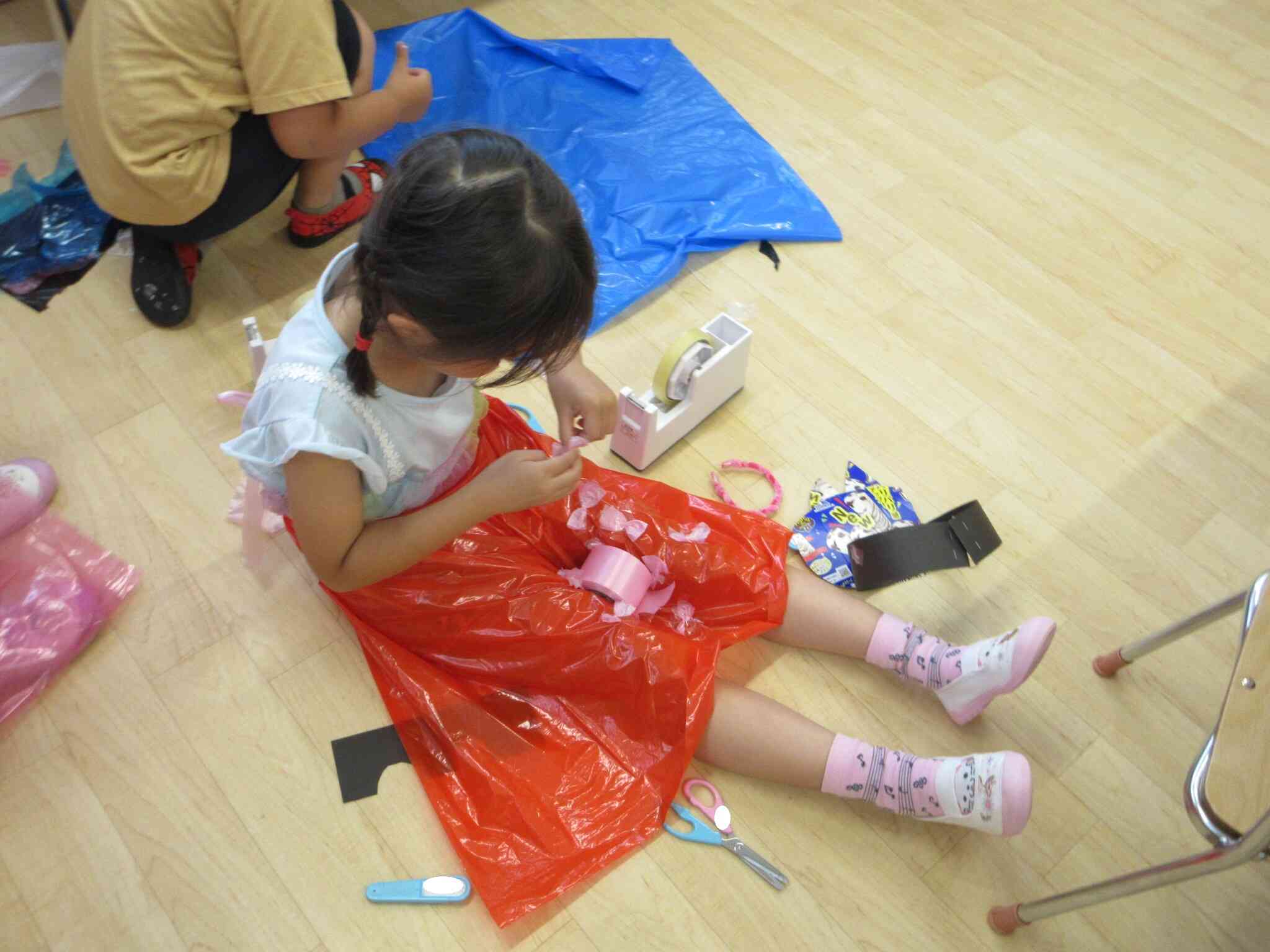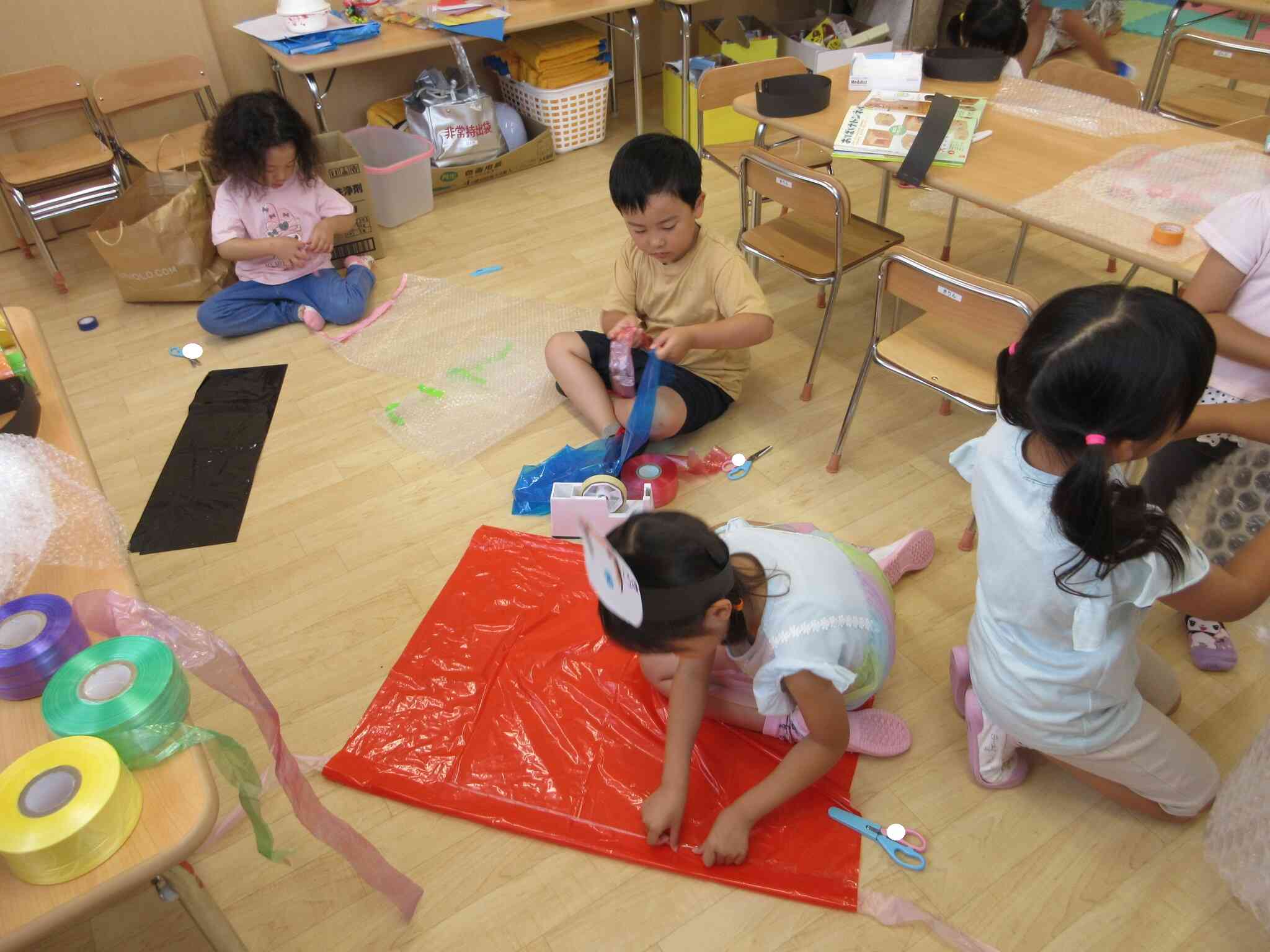 8月にスペシャルたいようDAYがあります。5歳児さんと話し合って子どもたち主体でお祭りやお化け屋敷をすることに決まりました。イメージがそれぞれであり、 衣装作りやチケット作りが盛り上がっています。レイモンド田無保育園社会福祉法人檸檬会行事夏祭り衣装作り。