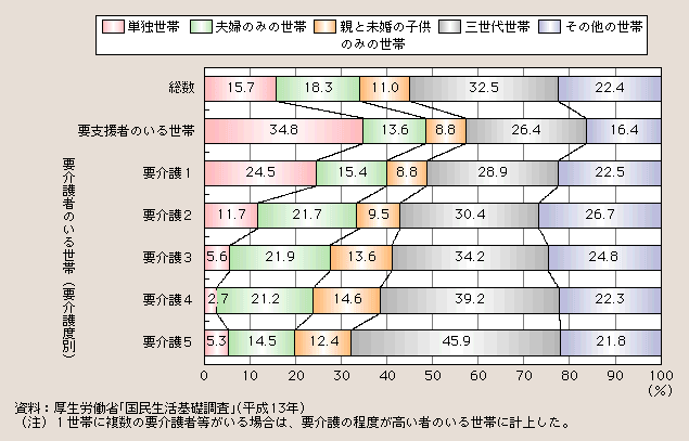 統計データ 要介護者等のいる世帯の世帯構造の構成割合の年次推移。