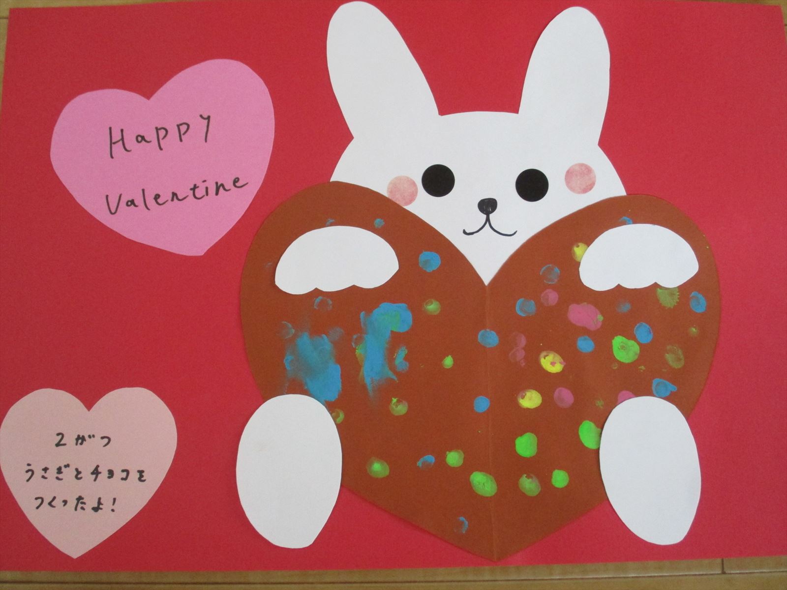 バレンタイン製作 指スタンプで可愛い、うさぎさんの壁面飾りの作り方ほいくびより。