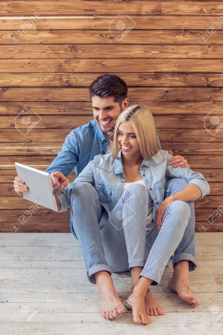 ジーンズ服で美しい若いカップルがハグ、タブレットを使用して、笑みを浮かべて、木製の壁に座っています。の写真素材・画像素材 Image 56427078。