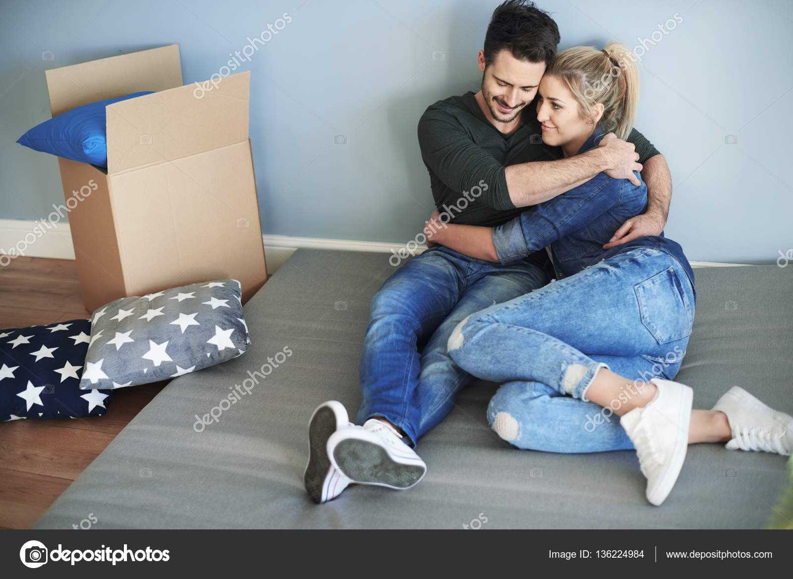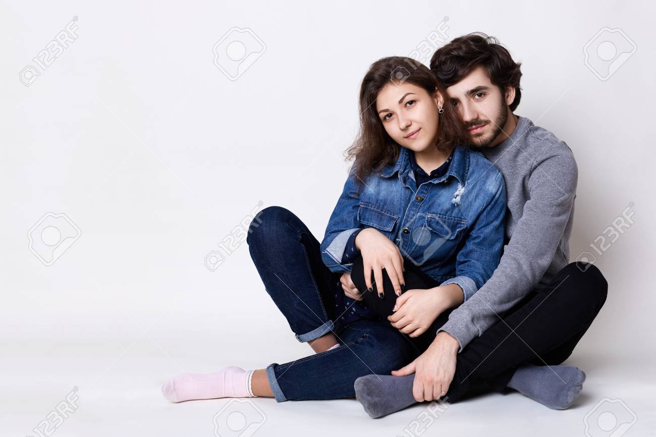 床に座ってカップルとハグ — ストック写真 © gpointstudio136224984。