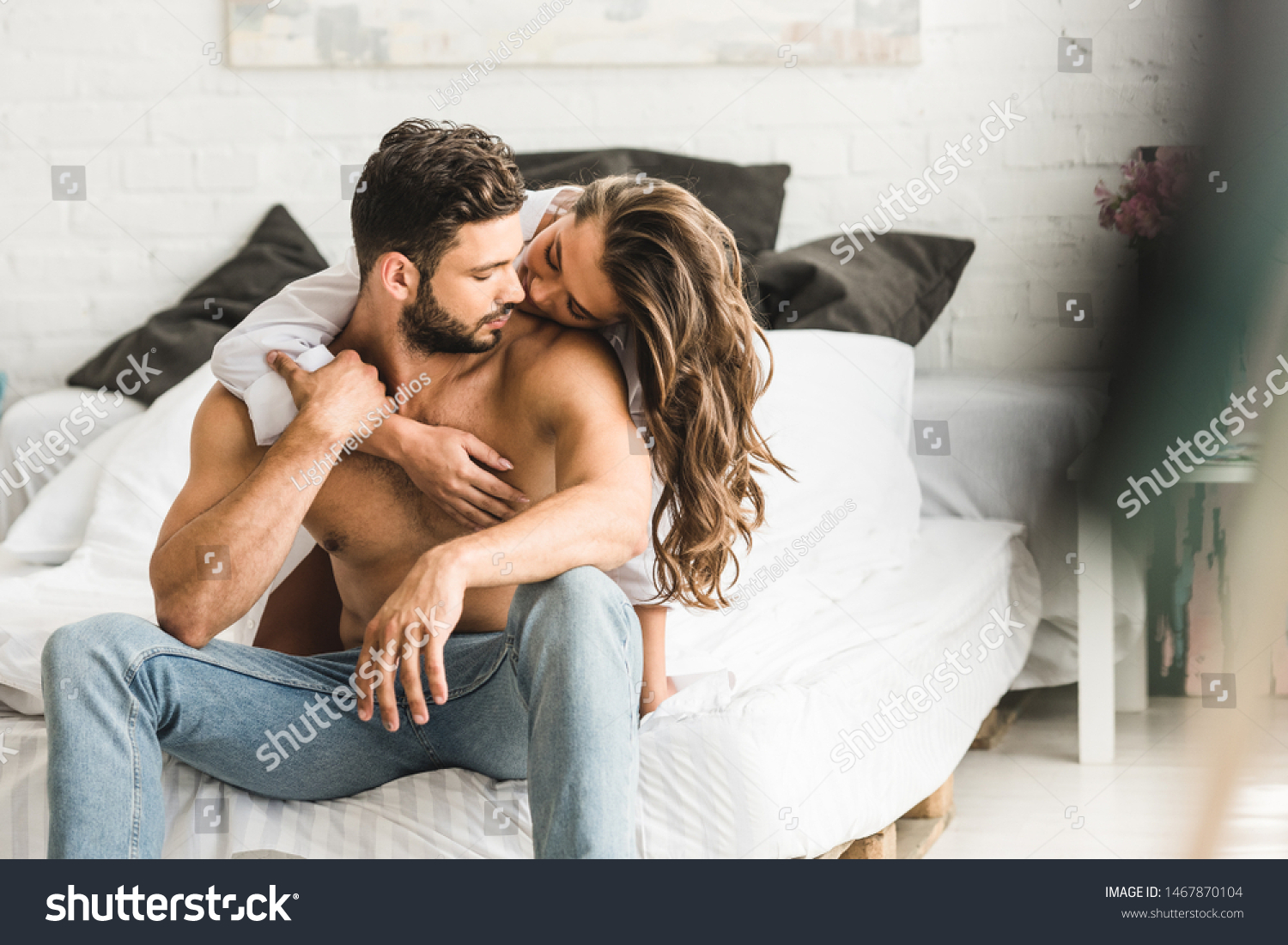2人の人がベッドに座りながらハグをすることの限定フォーカス写真素材1467870104Shutterstock。